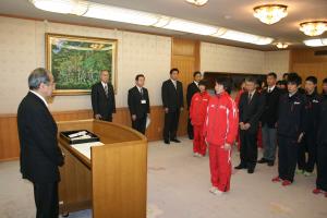 1月15日と22日に京都と広島で行われる全国都道府県対抗女子・男子駅伝大会に出場する選手が知事に出場のあいさつをしました。 知事は「栄えある大分県チームのメンバーに選ばれた皆さん、おめでとうございます。中学生、高校生、大学生・社会人でチームをつくり『たすき』をつなぐこの大会は、県民の皆さんの注目度も高く、地元大分はもちろん、開催地でも県人会の皆さんをはじめ多くの皆さんが熱い応援をしてくれることでしょう。体調管理に気をつけ、ベストコンディションで大会に臨み、存分に活躍してください」と激励しました。