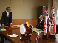 平成24年1月12日 由布市湯布院町の和太鼓演奏グループ「ゆふいん源流太鼓」代表 長谷川 義氏ほか関係者の方々が、「第8回日本太鼓シニアコンクール最高賞・名人位受賞」を知事に報告しました。 知事は、「最高位となる名人位の受賞、おめでとうございます。今回の受賞は、大分県の皆さんにとっても大きな励みになると思います。これからますますのご活躍を期待しています」と述べました。