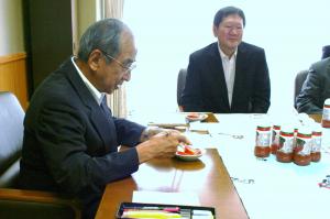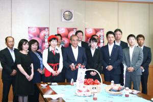 平成24年7月30日(月) 赤く熟してから収穫した赤採りトマトを使用したドレッシングが完成し、トマト生産者や加工業者、取組を支援した関係者の皆さんが来庁し、知事に報告を行いました。赤採りトマトを収穫する際に発生した裂果トマトを活用するため、様々な企業等が連携して商品開発を行い、酸味と旨みを最大限に活かしたドレッシングが生まれました。トマトにはもちろん、サラダやパスタにも使っていただけるドレッシングで「トマトもよろこぶドレッシング、トマトに生まれて良かった」をキャッチフレーズに8月下旬から販売されます。 |