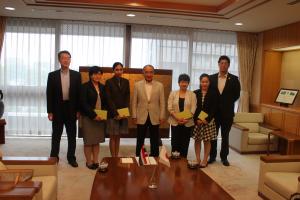 平成26年6月27日 県では東九州メディカルバレー構想の推進にあたり独立行政法人国際協力機構(JICA)との連携によって、タイの国立病院の医師、看護師を受け入れており、研修期間中の4名が知事を表敬訪問しました。 ワニア・ヌメン医師は「日本は水の純化技術が進んでいます。タイの患者のため、日本の技術を学びたい」と研修の意気込みを語り、知事は「医療は国際的に共有すべきもの。皆さんとともに成果をつくりあげていきたい」と応えました。 |
