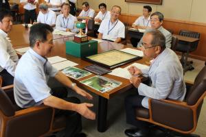 平成26年8月19日 「第1回全国自給飼料生産コンクール」で最優秀賞の農林水産大臣賞を受賞した豊後高田市の永松英治氏が知事へ受賞を報告するため県庁を訪れました。このコンクールは、自給飼料の生産技術や、放牧などの環境に調和した畜産経営の優秀な事例を全国から選定・表彰するものです。 永松氏は受賞報告に合わせ、受賞の決め手となった「子牛が生まれた直後にスキンシップをする、親牛と一緒に放牧する」などの独特の方法を紹介しました。これを受け知事は「すばらしい賞を受賞され、おめでとうございます。永松さんの畜産経営は大分の畜産にとって参考になるものです。今後も大分の畜産経営のお手本となり、ご活躍されることを期待しています」と激励しました。 |