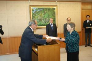 平成26年9月29日 「大分学」を提唱し、県内外へ大分県の魅力を発信するなど、地域の振興発展に貢献した故辻野功氏への県賞詞授与式が県庁で行われ、同氏の妻である辻野浩子氏が賞詞を代理受領しました。 賞詞授与後のあいさつで知事は「辻野様の『大分学』は我々県民も知らなかった大分の魅力をも掘り起こし、県内外へ広く発信する大変意義深いものです。今後も『大分学』が引き継がれ、大分の魅力が多くの方に伝わり続けることを祈っています」と述べました。 |