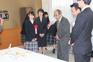 平成26年11月27日 県は株式会社ローソンと共催で、高校生・大学生・専門学校生を対象に県産食材を使った作品を募集する大会、「次世代応援 地産地消商品開発コンテスト」を開催し、ベーカリー・スイーツ・米飯の各部門の入賞者を決定しました。各部門で最優秀賞に輝いた作品は商品化され、県内のローソン全店で販売される予定です。商品化に先立ち県庁では、入賞作品の発表会と表彰式が行われました。 発表会では、知事、ローソン株式会社の川本孝広九州商品部長、福永康平大分支店長が入賞作品を味わいながら、学生たちの説明に耳を傾けていました。試食会の後に行われた表彰式では、知事が「皆さんのアイデアメニューを楽しく試食させていただきました。どの作品にも工夫が感じられ、味のセンスもすばらしいです。ローソンでの商品化を機に、大分のおいしい食材をたくさんの方に味わってもらいたいです」と話し、受賞者に賞状を手渡しました。 |
