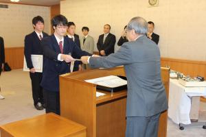 平成27年2月20日 県庁で「高校生技能振興奨励賞(平成26年度)」の表彰式が行われ、知事から7人の受賞者に対して表彰状が授与されました。この賞は、若手技能者の確保と技能の継承・向上を目的として、高校在学中に「技能検定2級」または「溶接技能者評価試験専門級」に合格し、県内の事業所に就職が内定している生徒に対し授与されるものです。 知事は受賞者それぞれに賞状と記念品を手渡し、「皆さんが大分で活躍され、地方創生の先陣を切っていただけることを期待しています。この受賞を機に、今後も努力を続けて必ず皆さんの夢を実現させてください」と激励しました。この後、受賞者を代表して大分県立中津東高等学校の新谷克弘さんが「名誉ある賞をいただき、ありがとうございます。今回の受賞を励みに、大分の技術力の向上につながるよう努力していきます」と決意を表明しました。 |