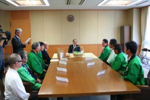 平成27年5月19日 新茶の時期を迎え、大分県茶業協会関連者9名が県庁を訪れ、知事に県内各地産の新茶の贈呈を行いました。新茶の贈呈とともに、お茶では県内2例目となるJGAPの認証を受けた○橋製茶(○は「高(はしごだか)」)のお茶と、県産茶を使用した菓子舗丸円堂の洋菓子の紹介し、知事が試飲・試食を行いました。 JGAPとは、農場やJA(農協)等の生産者団体が活用する農場管理の基準で、農林水産省が導入を推奨する農業生産工程管理手法の1つです。JGAPの基準には、120を超える農場のチェック項目が定められており、農薬の管理、肥料の管理など、食の安全や環境保全に関係する農作業について、明確な基準が定められています。 試食後、知事は「美味しいお茶と美味しいケーキをありがとうございます。霜などの厳しい条件の中、美味しいお茶ができたのは皆さまのご尽力の結果です。お茶は大分の農業にとって重要な品目であり、今後も伸びていくと予想されます。これからもいいお茶を作ってください」と激励しました。 |