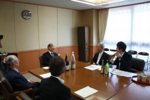 平成27年5月19日 2015年春季全日本酒類コンクールで、大分県内で酒類卸を行う株式会社ジェイジェイが芋焼酎部門第一位等の高位を、同社の委託製造元である合資会社赤嶺酒造場が麦焼酎部門第一位の高位を受賞したので、ジェイジェイ生野社長・生野専務、赤嶺酒造場赤嶺代表が県庁を訪れ、知事に報告を行いました。 ジェイジェイ生野専務は「今回の受賞に満足することなく、大分県産のもので更に美味しい焼酎を造っていきたい」と報告しました。報告を受け、試飲をした知事は「全国コンクールの受賞、心からお祝い申し上げます。大分は味力を売りにしていますが、美味しいお酒があれば美味しい食べものの箸が進みます。こうやって美味しいお酒が全国で名を馳せていただくことで大分県の食産業にも貢献していただいております。今後とも美味しいお酒を造っていってください」と述べました。 |