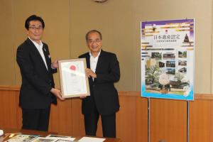 平成27年7月3日 日本各地に点在する有形・無形の文化財を地域的なつながりや時代的な特徴ごとにまとめ、その魅力を国内外に発信していくため、「日本遺産」という制度が今年度より文化庁により設けられました。その中で「近世日本の教育遺産群」として日田市の咸宜園が認定され、認定書の交付を受けたことを知事に報告するため、日田市の原田市長、日田市教育委員会の三笘教育長、日田商工会議所の高山会頭、日田市教育庁咸宜園教育研究センターの池田所長が県庁を訪れました。 原田市長は「今回の日本遺産認定を契機に、世界遺産登録に向けてがんばります。また、7月から始まったデスティネーションキャンペーン(以下DC)と合わせて、日田市の認知度を高めていきたい」と挨拶し、知事は「地域と人の創生として人を育てることが重要となっている今、教育遺産として認定されたことは大きな意義があることだと思います。DCと組み合わせることで、教育に加えて、経済の活性化につながることを期待します」と答えました。 |
