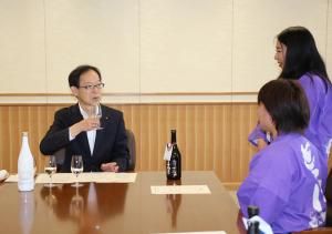 令和5年8月3日 フランス・パリで 2023 年 5 月に開催された、日本酒コンクール「Kura Master(クラマスター)2023」において、県内の蔵元の日本酒・焼酎がプラチナ賞・金賞を受賞したことから、受賞蔵元4社[有限会社南酒造(国東市)、八鹿酒造株式会社(九重町)、有限会社中野酒造(杵築市)、佐藤酒造株式会社(竹田市)]の代表が県庁を訪れ、知事に受賞報告を行いました。 Kura Master(クラマスター)は、フランスで行うフランス人のための日本酒コンクールとして2017 年から開催されており、「日本酒」、「焼酎・泡盛」の 2 つのコンクールがあります。審査員は、フランス人を中心としたヨーロッパの方々で、フランス国家が最高職人の資格を証明する「国家最優秀職人章」の保有者をはじめ、フランスの一流ホテルのトップソムリエやレストラン、ホテル、料理学校関係者など飲食業界のプロフェッショナルで構成されています。 2023 年は、日本酒コンクールには、世界の340 蔵から 1090 銘柄、本格焼酎・泡盛コンクールには、85 蔵から 187 銘柄が出品され、県内の蔵元は、9銘柄が受賞しました。受賞銘柄は、下記の通りです。 【受賞銘柄】 ◎プラチナ賞(2 銘柄) ・喜納屋(きのや):麦焼酎部門/南酒造 ・八鹿 純米大吟醸【金】 WhiteBottle2023ver.:純米大吟醸酒部門/八鹿酒造 ◎金賞(7 銘柄) ・とっぱい:麦焼酎部門/南酒造 ・八鹿 特別純米【緑】:純米酒部門/八鹿酒造 ・八鹿 awa sake 白虹:サケ スパークリング部門/八鹿酒造 ・銀座のすずめ ガスライト:麦焼酎部門/八鹿酒造 ・ちえびじん 純米吟醸山田錦:純米酒部門/中野酒造 ・ちえびじん 本格焼酎:バラエティー焼酎部門/中野酒造 ・kuju senbaduru andante:純米酒部門/佐藤酒造 純米大吟醸酒部門でプラチナ賞を受賞した、「八鹿 純米大吟醸【金】 WhiteBottle2023ver.」を製造した八鹿酒造株式会社の麻生益寛代表取締役専務は、「海外の日本酒コンテストを意識して造りました。今年は麦焼酎部門でも金賞をいただき、光栄に思っています」と、バラエティー焼酎部門で金賞を受賞した「ちえびじん 本格焼酎」を製造した有限会社中野酒造の中野淳之代表取締役社長は、「弊社は日本酒をメインで造っていますが、純米大吟醸の製造過程で出た酒粕を使って焼酎を造ったところ、今まで飲んだことのない味の焼酎に仕上がり、受賞することができました」と、それぞれに受賞の喜びを語りました。 佐藤知事は、受賞した銘柄をそれぞれ試飲した後、「香りがあり、ほんのりとした甘みと上品さもあって、飲みやすく美味しいですね。皆さんの品質管理などの努力のたまもので、敬意を表したいです。フランス人のソムリエに評価されたお酒なので、西洋料理にも合うのだろうし、県産の日本酒・焼酎のマーケットが世界中に広がることに期待したいです。来年は福岡・大分デスティネーションキャンペーン、再来年は、関西・大阪万博もあり、海外のお客さんもたくさん大分県にいらっしゃいます。大分の日本酒、焼酎の美味しさを世界に発信して欲しいと思います」と、今後の日本酒・焼酎の需要の広がりに期待感を示しました。