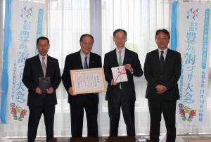 令和6年5月31日 第43回全国豊かな海づくり大会大分県実行委員会では、大会の基本理念に賛同する企業や団体等からの協賛を受け付けています。このたび、大分県信用組合から多額の協賛の申し出があり、関係者が県庁を訪れ、協賛金目録贈呈式を行いました。 大分県信用組合理事長の𠮷野一彦さんは、「今年、大分県で第43回全国豊かな海づくり大会が盛大に開催されることに対し、少しでもお役に立ちたいと思い、少額ではありますが私達の気持ちを伝えに来ました」と、協賛の趣旨を話しました。佐藤知事は、「多額の協賛金をいただいたことに、心から感謝申し上げます。いただいた協賛金は、イベントPR等のため大切に使わせていただきます。大分の産業をきめ細かく支えてくださっている皆さんのサポートに対し、改めて感謝申し上げるとともに、引き続きご支援をいただきたいと思います」と、謝辞を述べました。