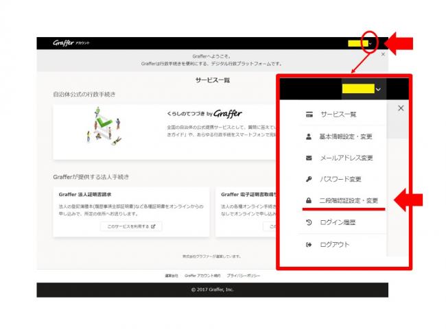 2. Graffer アカウントのメニューから「二段階認証設定・変更」をクリックする