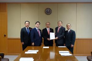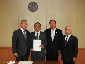 行財政改革・グローバル戦略特別委員会の志村委員長が、田中利明議長とともに広瀬知事を訪れ、「県の組織再編」「県有財産の在り方」「グローバル戦略」などについて政策提言を行いました。