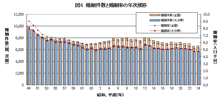 平均初婚年齢は、夫30.3歳(全国では30.8歳)、妻29.1歳(全国では29.2歳)でした。