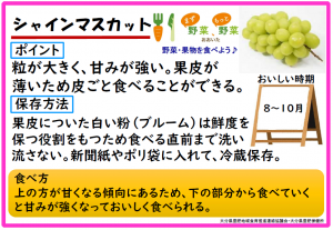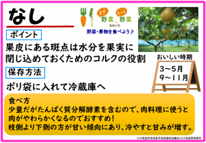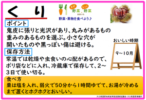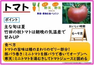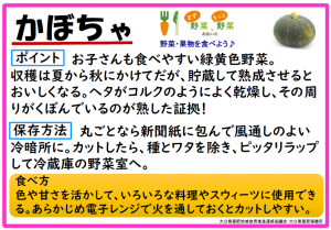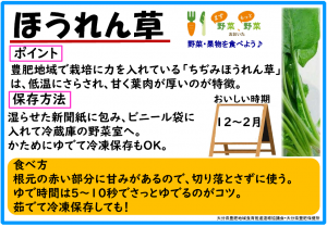豊肥地域食育推進連絡協議会では、農産食材豊かな地域の特性を生かした食育の取り組みとして、食育情報(豆知識、旬、保存方法等)を掲載した野菜のPOP[ポップ]を作製しました。