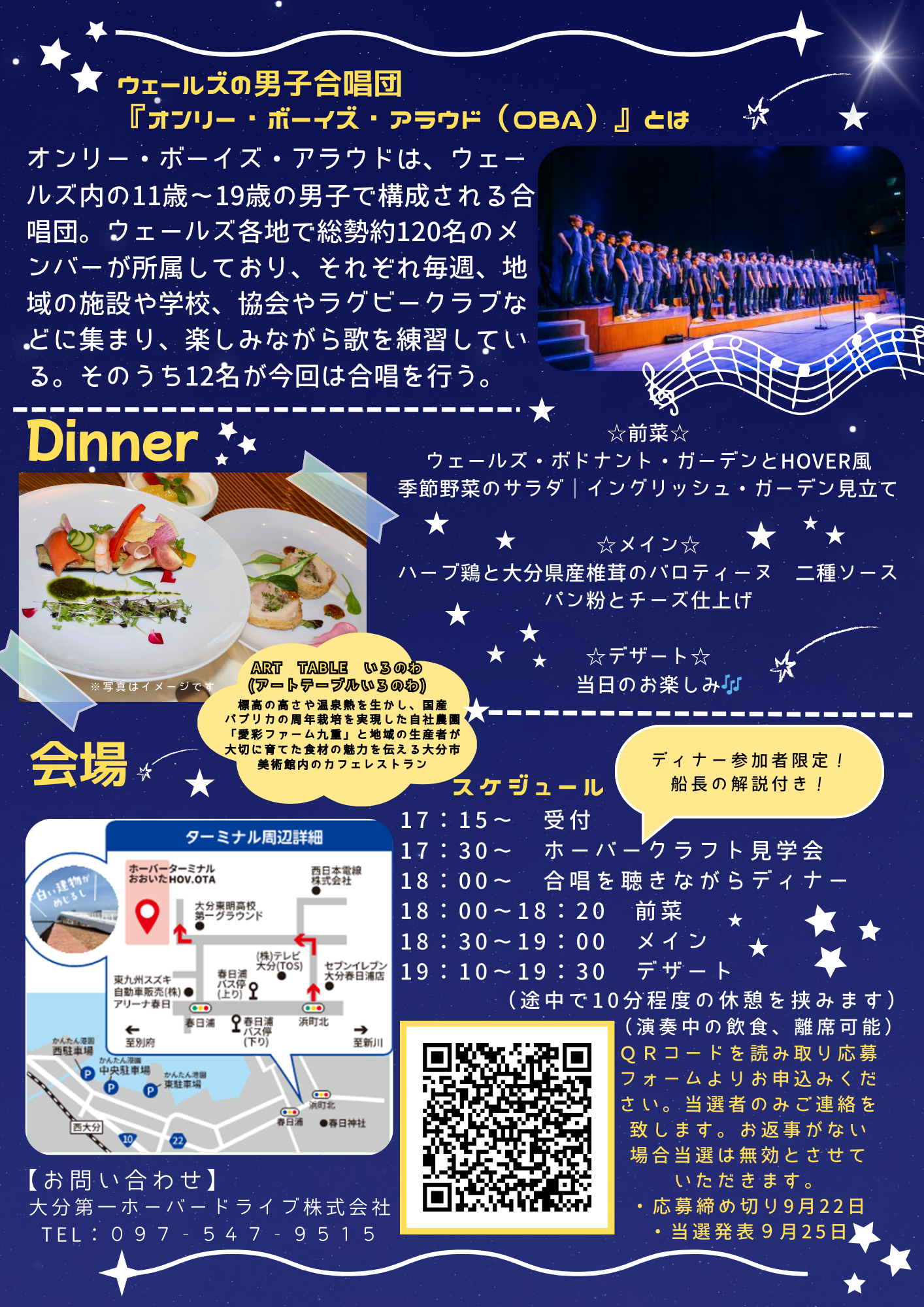 第四弾の今回は、10月10日に「ホーバー×ウェールズ男子合唱団」を実施します。ウェールズ男子合唱団(オンリー ボーイズ アラウド)の合唱を聴きながら素敵なディナーを楽しみませんか?