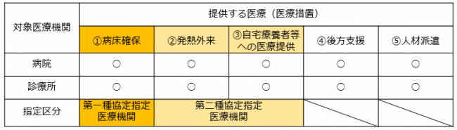 協定締結医療機関のうち、指定基準を満たした協定締結医療機関を第一種協定指定医療機関(病床の確保)または第二種協定指定医療機関(発熱外来・自宅療養者等への医療)に指定します。