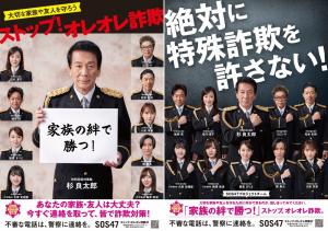 ※Sos47プロジェクトチームとは…2018年に、杉良太郎さんや伍代夏子さん、コロッケさんなど、芸能界でご活躍されている方々で結成された特殊詐欺被害防止対策のプロジェクトチームです。芸能活動を通じて情報発信などを行い、幅広い世代への働きかけを強化するなど、広報啓発を推進しています。