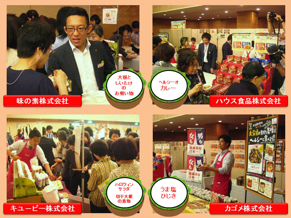 各社が『うま塩への取組(レシピ開発、減塩製品の紹介等)』を発表し、紹介した食品の試食を行いました。各社が自社の強みを生かした減塩製品の紹介及び試食を行うことで、参加者(一般県民、120人)は「うま塩の実践に向けた知識や情報」を学ぶことができました。