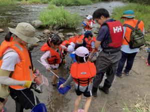 令和5年9月2日(土曜日)に玖珠川と九重青少年の家で「第2回 森の子レンジャー」を開催しました。午前中は、玖珠川で「川の生き物探し」(自然観察)をしました。午後は、九重青少年の家とその敷地内にある沢で「魚のわなづくり」(工作活動)と「小川で魚とり」(自然観察)をしました。魚やエビ、カニなどをたくさん発見しました。