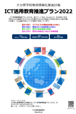 ICT活用教育推進プラン2022は、超スマート社会(Society5.0)を主体的に生き、未来の大分を創造する子どもたちを育成するための取組の方向性を定めた今後3年間の計画で、4つの基本方針で作成しています。