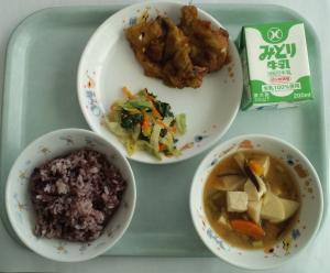 黒米ごはん、牛乳、ふるさとみそ汁、ひらまさのお茶揚げ、なばっぴー和え