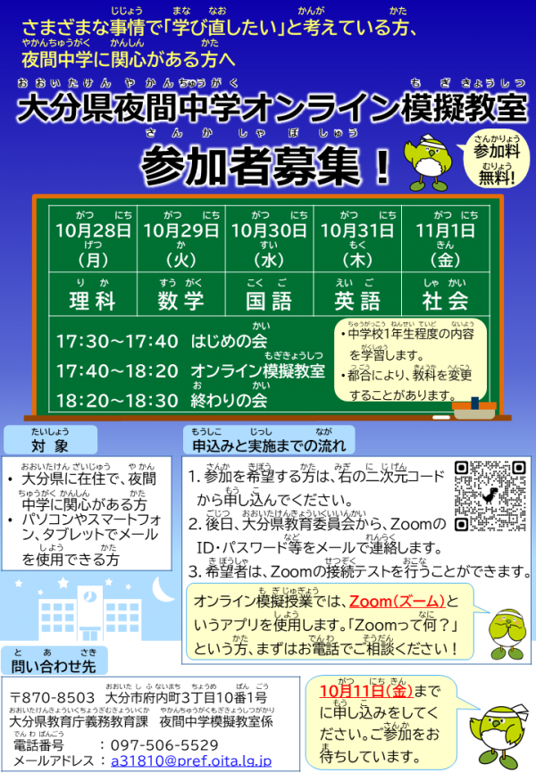 大分県教育委員会(おおいたけんきょういくいいんかい)では、夜間中学(やかんちゅうがく)の設置(せっち)に向(む)けて、オンラインを活用(かつよう)した模擬教室(もぎきょうしつ)を行(おこな)います。