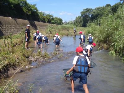 小学生が各自1本たも網を持ち、川の中で捕獲体験をしました。