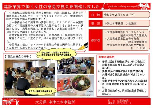 令和3年2月10日に、大分県測量設計コンサルタンツ協会中津地区女性社員、大分県建設業協会青年部会中津支部女性社員、県中津土木事務所女性職員の計30名で、「女性が元気に活躍し、業務を円滑に進めるためのネットワークづくり」を目的として、中津地域の建設業界に携わる女性の意見交換会を実施しました。