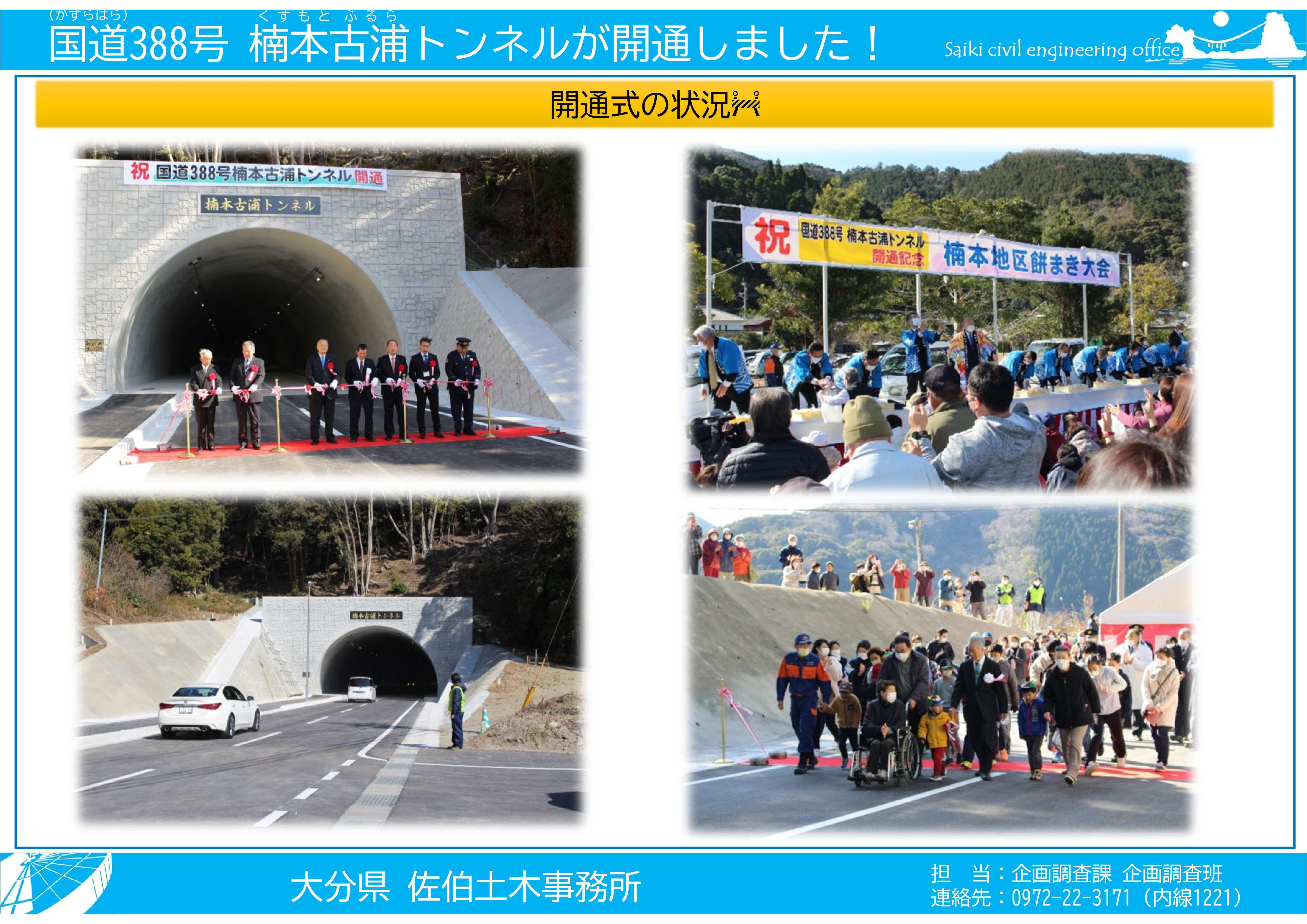一般国道 388号 畑野浦~楠本工区(L=7,400m)のうち、楠本古浦トンネルを含むバイパス区間(L=540m)が令和5年2月5日(日曜日) 12時に開通しました。