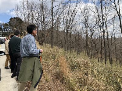 七島藺学舎で国東半島宇佐地域世界農業遺産の概要や七島藺の歴史、くにさき七島藺振興会の取組についての説明の後、国東市内にて、クヌギ林、しいたけ原木の伏せ込み場所を訪れ、樹齢別のクヌギの生育状況や防獣ネットを見学されました。