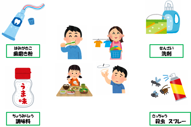 歯(は)をみがく、ごはんを食べる、洗濯(せんたく)をする・・・。わたしたちは、ふだんの生活の中でさまざまな化学物質(かがくぶっしつ)を利用(りよう)しています。