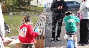 (賞味期限の近い食品などの「おやつガチャ」、エアロバイク発電体験の様子)