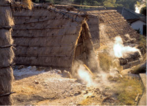 別府市の明礬温泉。鼻をつく硫黄の匂いや立ち上る噴気とともに、藁葺きの湯の花小屋が立ち並ぶ特徴的な温泉地です。