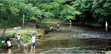 青の洞門を発ち玖珠町に向かうと、石柱群に囲まれた神秘の空間「深耶馬渓」に入ります。天然の一枚岩が続く「大谷渓谷」は、沢歩きが楽しめる絶好の避暑地です。