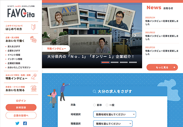 大分の旬で魅力的な情報、きらりと光る企業の紹介、大分で働く先輩のインタビューなど大分の魅力をWEBマガジンで紹介するほか、就職に役立つイベント情報などをお届けします。