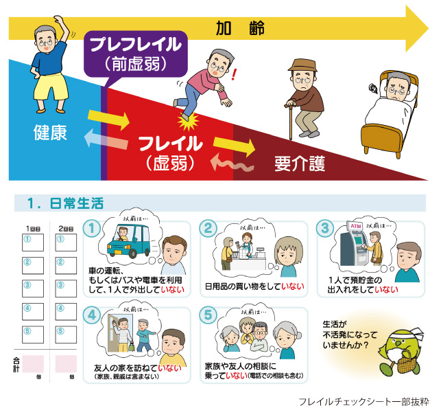 フレイルの早期発見・適切な予防に向けて半年に1回を目安に、フレイルチェックシートでご自身やご家族の体や心の状態をチェックしてみましょう。