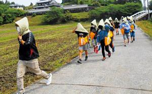 非常持ち出し袋を持って高台へ避難する子どもたち