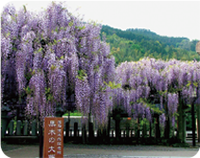 国の天然記念物であり、約3,000平方メートルもの広大な藤棚。美しく咲き誇る紫の花々は圧巻!