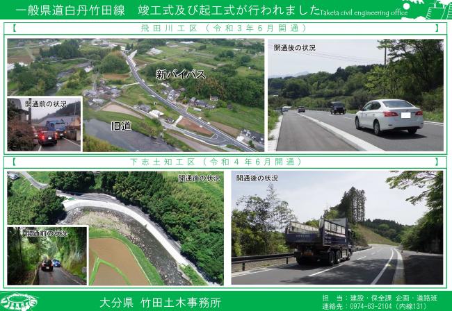 一般県道白丹竹田線の竹田市飛田川地区から添ケ津留地区まで約12km区間の2車線改良が完成したため、地元地区で組織する県道白丹竹田線道路期成会による竣工式が執り行われました。また、今年度から工事着手する添ケ津留工区の起工式も併せて執り行いました。