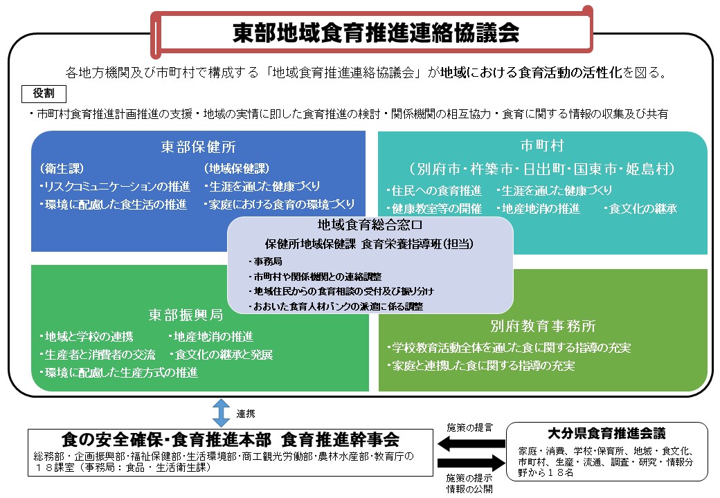 東部地域食育推進連絡協議会は、大分県の食育推進体制の中に位置づけられており、食の安全確保・食育推進本部と連携しながら、東部地域において、食育の活性化を図ることを目的に設置されています。