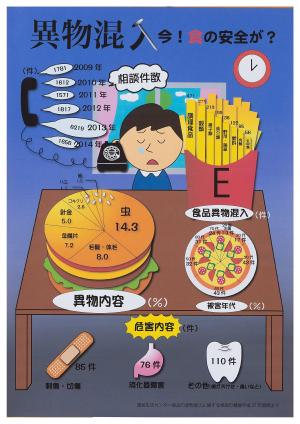 ![]() | 「異物混入今!食の安全が?」 大分県立鶴崎工業高等学校 3年 小椋 玲 タイムリーな(?)な話題の選択がまず良いと思いました。またグラフの1つ1つがファーストフードになっているアイデアが面白いと思いました。また構図が泣いている人物を中心にして机の上の食べ物、電話というのがナイスアイデアだと思います。 |