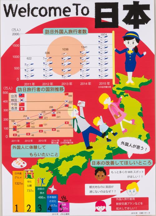 「Welcome To 日本」 大分県立鶴崎工業高等学校 3年 葛城 舞華 日本全体をテーマとして、大きな視点でテーマを絞り、配色も対比的な色使いで視認性を高め、視線が上から下へ自然に誘導され、また上へと戻される流れができている。 |