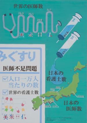 ![]() | 「医師不足問題」 大分県立鶴崎工業高等学校 2年 足立 裕美 世界の医師数、看護士数と日本の現状の比較をすることで、日本の医師不足の問題がわかりやすく伝わる内容になっています。色数も押さえられていて落ち着いた雰囲気です。聴診器や注射器、薬のカプセルなどを上手に使い医療問題を扱ったグラフならではの表現になっていますが、「医師不足問題」の文字をもっと大きく入れると画面がもっと引き締まると思います。 |