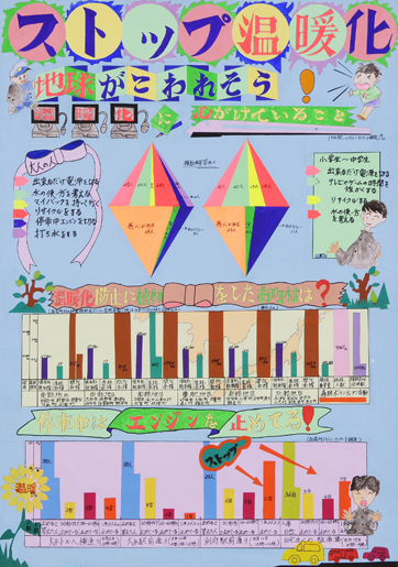 「中学1年生~心の中をのぞいてみたら~」 私立明豊中学校 1年 山本 眞実 写真ではわかりづらいのですが、それぞれのグラフが紙を切り抜いて立体的に表現されています。また、グラフや文字の配置がとても整然としており、見ていて非常にすっきりとした印象で、見やすいそして理解しやすいグラフに仕上がっています。 |