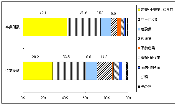 産業大分類別に従業者数をみると、「サービス業」が173,505人で全従業者の32.0%と最も多く、次いで「卸売・小売業,飲食店」が153,024人(28.2%)、「製造業」が77,516人(14.3%)、「建設業」が58,485人(10.8%)、「運輸・通信業」が28,643人(5.3%)となっている。