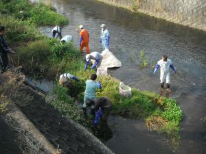 特定外来生物として指定されている「オオフサモ」を除去することを目的として行うものです。