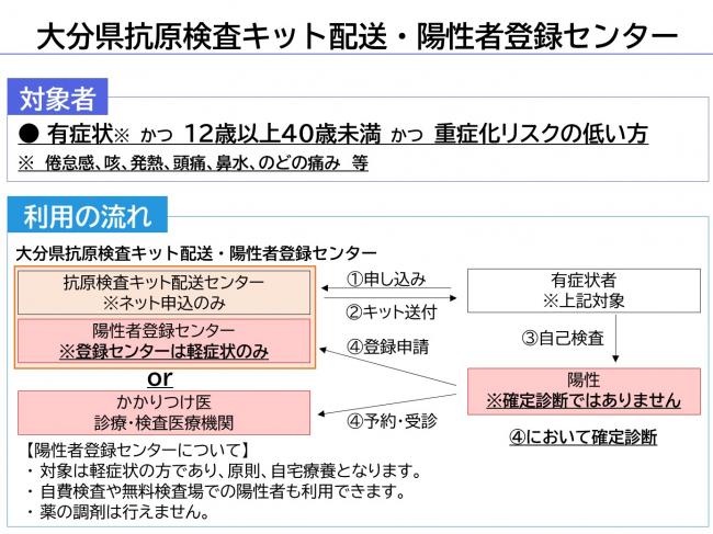感染者の急増により、診療・検査医療機関(いわゆる発熱外来)への受診者が増え、受診に時間を要する事態が生じています。発熱外来の逼迫を回避するため、県では、症状がある12歳以上40歳未満の方で基礎疾患等がなく重症化リスクの低い方を対象に、抗原検査キットを無料配布することとします。ウェブ申請による郵送と、お急ぎの方に対する一部の医療機関(別途、県ホームページで公表)による直接配布を、明8/24(水)から開始します。併せて、自己検査により陽性となった方が医療機関を受診することなく、保健所に発生届が提出される「陽性者登録センター」も明日から開設します。抗原検査キット無料配布の対象となる方は、こうした仕組みを利用していただき、高齢者や基礎疾患のある方、お子さんが速やかに医療機関を受診できるよう、ご協力よろしくお願いします。