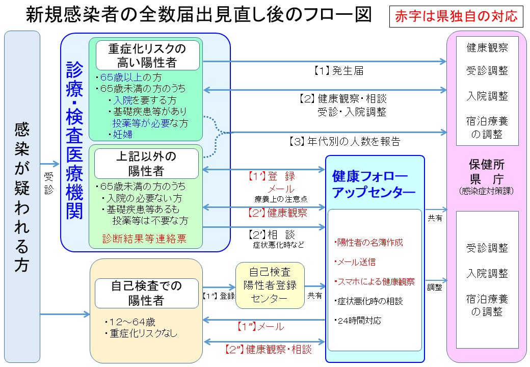 併せて、医療機関を受診せず自己検査で陽性となった方についても、同様の心配があるので、先月開設した「陽性者登録センター」を「自己検査陽性者登録センター」と改め、そこに登録していただくことで【1’’】、フォローアップセンターから同様の支援【2’’】を受けられるようになります。