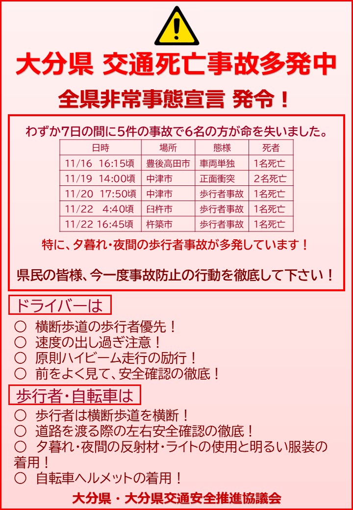 大分県・大分県交通安全推進協議会では、県民の交通安全意識を喚起するとともに、関係機関・団体が協力して、総合的かつ集中的な交通事故防止対策を推進することにより、早期に交通死亡事故の発生を抑止することを目的として県知事名による「交通死亡事故多発全県非常事態宣言」を発令しました!
