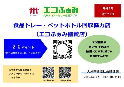 エコふぁみ協賛店に登録された県内のスーパー等が実施する食品トレー・ペットボトルの回収に協力することで「エコふぁみ(九州エコファミリー応援アプリ)」のポイントが貯まります!