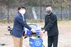 「大型ドローンによる大量輸送」では、株式会社SkyDrive製の「カーゴドローン」を使い、神田楽市から約1km離れた山香中学校まで、全校生徒150名分の菓子類(チョコレート菓子とお饅頭)を運搬するとともに、神田楽市から約1km離れた杵築市営サッカー場で練習する大分トリニータのサッカースクールにスポーツドリンクをコーチ等に運搬しました。